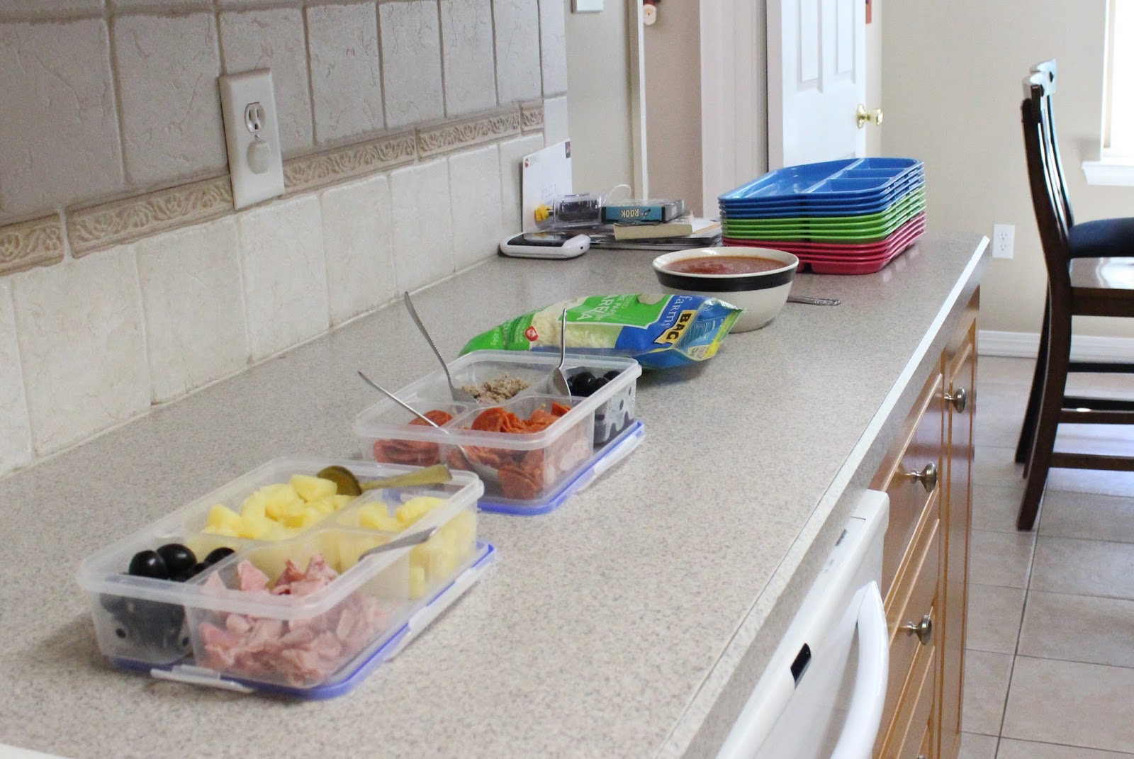 My mom had these fun little lunch trays that we took advantage of. It worked well to be able to put the sauce, the cheese, the toppings in all of the different sections.